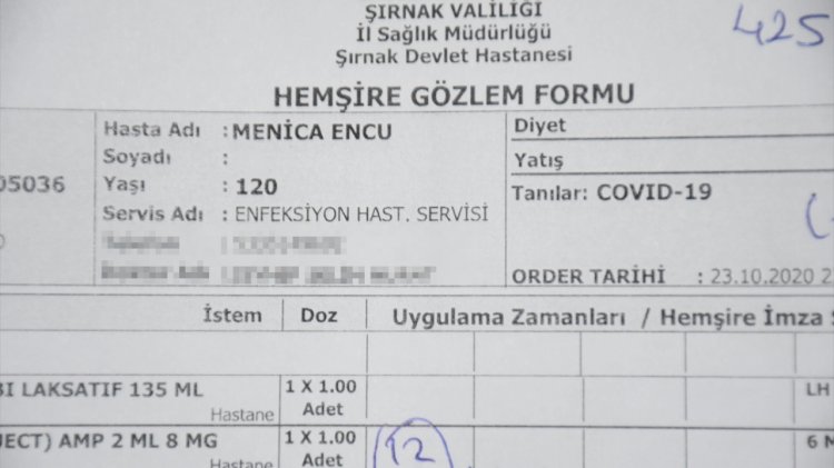 Şırnak'ın Uludere ilçesi Ortabağ köyünde yaşayan 120 yaşındaki Menica Encü, gördüğü tedaviyle yeni tip koronavirüsü (Kovid19) yenmeyi başardı. 12 çocuk, 100'ü aşkın torunu bulunan Encü, 15 gün önce İl Sağlık Müdürlüğü mobil ekiplerince yapılan sağlık taramasında Kovid19 test sonucunun pozitif çıkması üzerine pandemi hastanesi olarak hizmet veren Şırnak Kadın Doğum ve Çocuk Hastanesinde tedavi altına alındı.