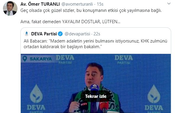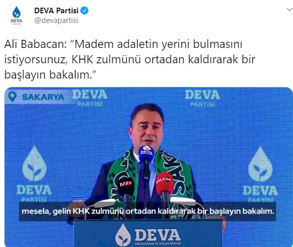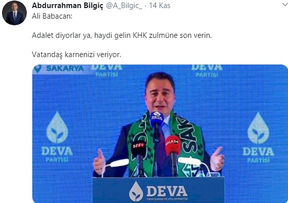 DEVA Genel Başkan Yardımcısı Abdurrahman Bilgiç de Babacan'ın sözlerini paylaşarak "Adalet diyorlar ya, haydi gelin KHK zulmüne son verin." dedi.
