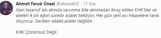 AKP'de milletvekilliği yapıp daha sonra, Saadet Partisi oradan da DEVA Partisi'ne geçen Ahmet Faruk Ünsal da KHK'lılar için mesaj paylaştı. Ünsal, "KHK’liler ve aileleri 4 yılı aşkın süredir adalet bekliyor." dedi.