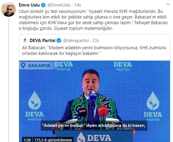 Firari FETÖ'cü Emre(Emrullah) Uslu, sosyal medya hesabından "Uzun süredir şu tezi savunuyorum: "siyaset mevzisi KHK mağdurlarıdır. Bu mağdurlara kim etkili bir şekilde sahip çıkarsa o öne geçer. Babacan'ın etkili olabilmesi için KHK'lılara gür bir sesle sahip çıkması lazım." Nihayet Babacan o boşluğu gördü. Siyaset toplum matematiğidir." dedi.