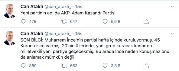 “Son bilgi: Muharrem İnce'nin partisi hafta içinde kuruluyormuş. 45 kurucu isim varmış. 20'nin üzerinde, yani grup kuracak kadar da milletvekili yeni partiye geçecekmiş. Bu arada İnce neden konuşmaz onu da anlamak mümkün değil.”