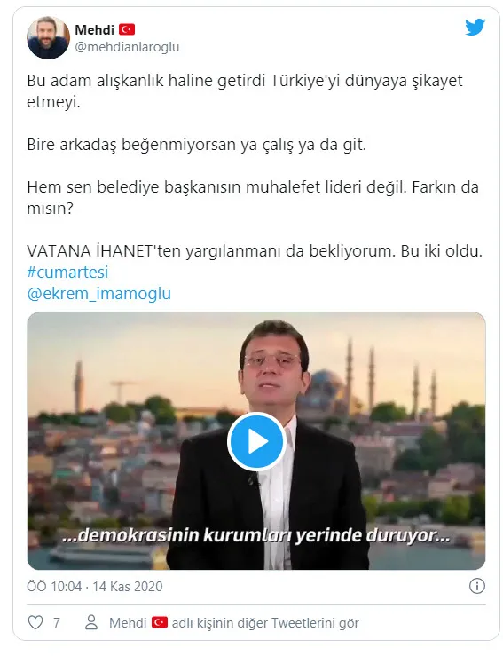 İmamoğlu konuşmasında Türkiye ile ilgili skandal ifadeler kullandı. Türkiye'yi dünyaya şikayet eden, ülkede demokrasi ve özgürlüğün olmadığı şeklinde gerçek dışı iddialarda bulunan İmamoğlu'nın konuşması büyük tepki çekti.