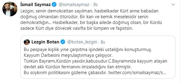 Saymaz’ın bu sözlerine ise HDP’li Botan’dan skandal tepki geldi. Botan, Saymaz’ın “HDP'liler saltanat mı arzuluyor” sözlerine ilişkin, Twitter hesabından yaptığı paylaşımda şu ifadeleri kullandı: