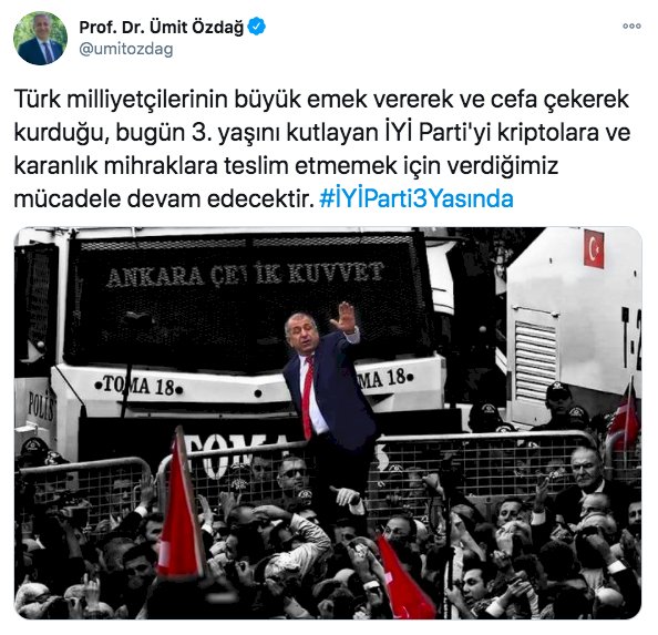 Öte yandan, Ümit Özdağ'da İYİ Parti'nin 3. kuruluş yılı için paylaştığı kutlama mesajında meydan okudu. Özdağ, “Türk milliyetçilerinin büyük emek vererek ve cefa çekerek kurduğu, bugün 3. yaşını kutlayan İYİ Parti'yi kriptolara ve karanlık mihraklara teslim etmemek için verdiğimiz mücadele devam edecektir” dedi.