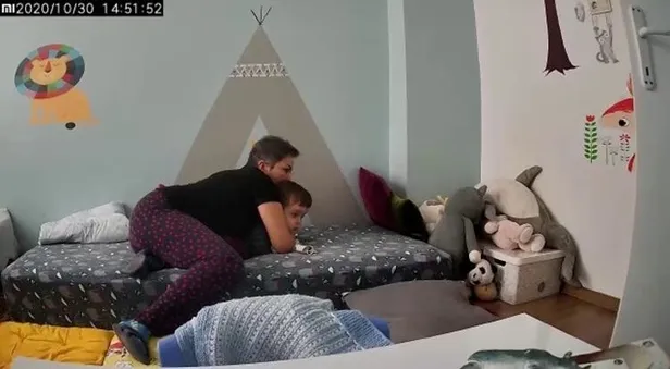 Deprem anında odaya giren anne, hemen çocuğunun üzerine kapanarak korumaya alıyor.
