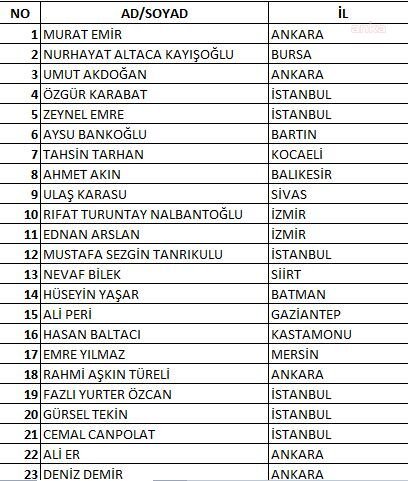 Ayrıca, Kılıçdaroğlu'nun avukatı Celal Çelik, danışmanları Deniz Demir ve emekli general Ali Er de listede yer alıyor.
