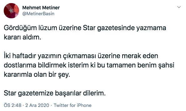 AKP'li Mehmet Metiner açıklamasında “Gördüğüm lüzum üzerine Star gazetesinde yazmama kararı aldım. İki haftadır yazımın çıkmaması üzerine merak eden dostlarıma bildirmek isterim ki bu tamamen benim şahsi kararımla olan bir şey. Star gazetemize başarılar dilerim” dedi.