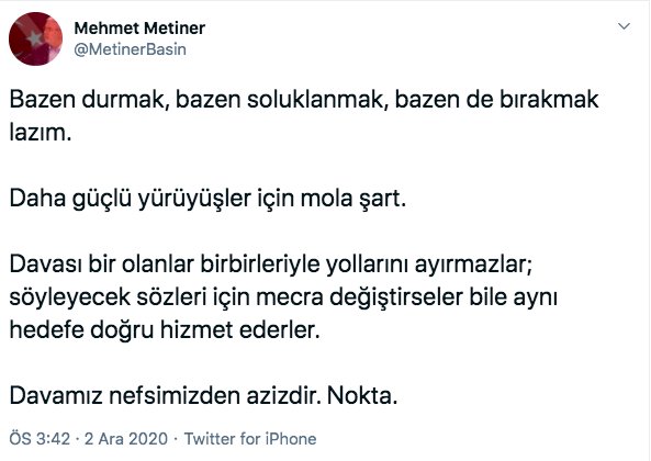 Metiner, bir başka paylaşımında da “Bazen durmak, bazen soluklanmak, bazen de bırakmak lazım. Daha güçlü yürüyüşler için mola şart. Davası bir olanlar birbirleriyle yollarını ayırmazlar; söyleyecek sözleri için mecra değiştirseler bile aynı hedefe doğru hizmet ederler. Davamız nefsimizden azizdir. Nokta.” ifadelerini kullandı.
