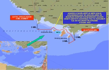 04 Ocak 1932 tarihli Türkiyeİtalya Arasında Anadolu Kıyısı ile Meis Adası Arasında Karasularının Sınırlandırılması ve Bodrum Karşısındaki Kara Ada’nın Egemenliği Konusunda Sözleşme.