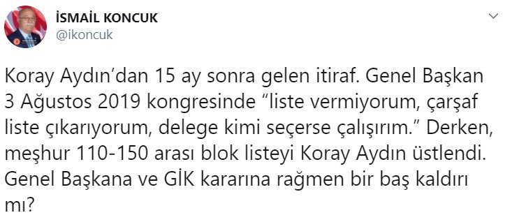 Koray Aydın’dan 15 ay sonra gelen itiraf. Genel Başkan 3 Ağustos 2019 kongresinde “liste vermiyorum, çarşaf liste çıkarıyorum, delege kimi seçerse çalışırım.” derken, meşhur 110150 arası blok listeyi Koray Aydın üstlendi. Genel Başkana ve GİK kararına rağmen bir başkaldırı mı?