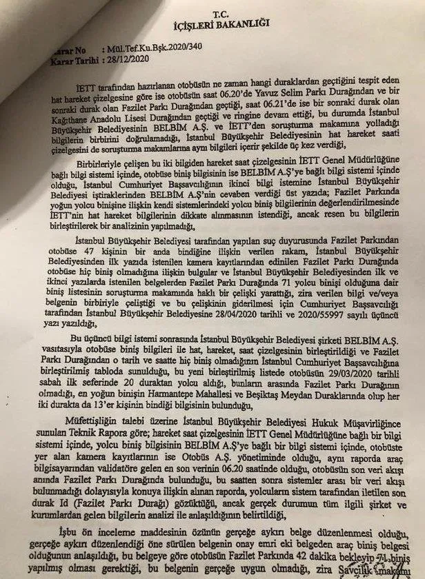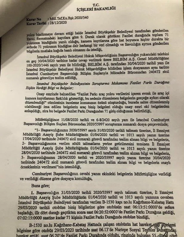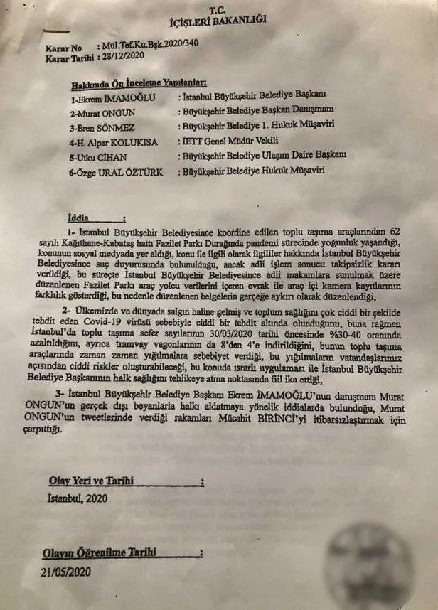 İçişleri Bakanı Süleyman Soylu; Fazilet durağı soruşturmasında yeteri kadar araştırma yapılmadan suç duyurusunda bunulması için onay veren İstanbul Büyükşehir Belediye (İBB) Başkanı Ekrem İmamoğlu ve İBB 1. Hukuk Müşaviri Eren Sönmez, suç duyurusunda doğru olmayan bilgilerin kaynağı İBB Başkan Danışmanı Murat Ongun, idari bir görev niteliğindeki suç duyurusunu fillen hazırlayıp sunan İBB Hukuk Müşaviri Özge Vural Öztürk hakkında soruşturma izni verilmesine karar vermişti.. Söz konusu kişiler, suç duyurusunda ve soruşturma esnasında sahte evrak hazırladığı iddiasıyla ifade vereceği öğrenildi.