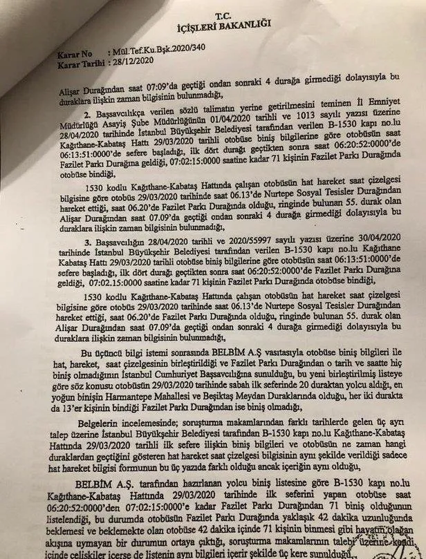 Sabah'ın haberine göre, İçişleri Bakanlığı müfettişleri; Murat Ongun'a, 29 Mart 2020 tarihinde Fazilet durağından hiç yolcu binmemesine rağmen 47 yolcunun bindiği bilgisine nasıl ulaştıklarını sordu.