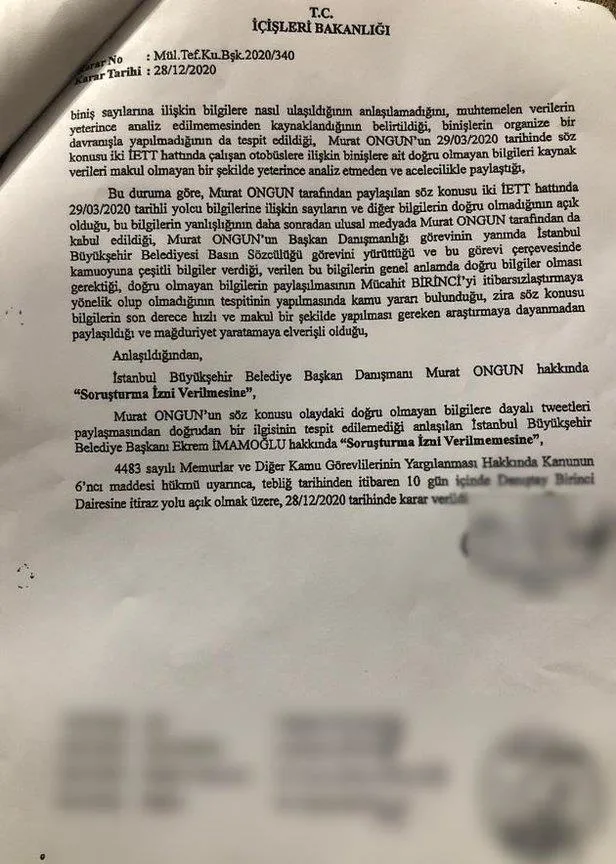 İçişleri Bakanlığı müfettişleri; alınan ifadelerden İBB Başkan Danışmanı Murat Ongun'un Fazilet durağına ilişkin verilerin kesinleşmeden paylaşımda bulunduğunu tespit etti.