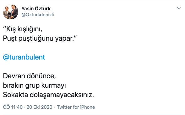 İYİ Parti Denizli Milletvekili Yasin Öztürk ise Bülent Turan'ı etiketleyerek, "'Kış kışlığını, Puşt puştluğunu yapar.' @turanbulent Devran dönünce, bırakın grup kurmayı Sokakta dolaşamayacaksınız." diye yazdı.