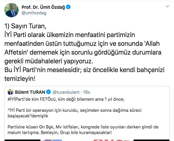 İYİ Parti Milletvekili Ümit Özdağ'ın partisine yönelik eleştirileri ve İstanbul İl Başkanı Buğra Kavuncu hakkındaki "FETÖ'cü" suçlamasına ilişkin açıklama yapan AKP Grup Başkanvekili Bülent Turan’a İYİ Parti içinden yanıt geldi. Özdağ, "Siz öncelikle kendi bahçenizi temizleyin" dedi.
