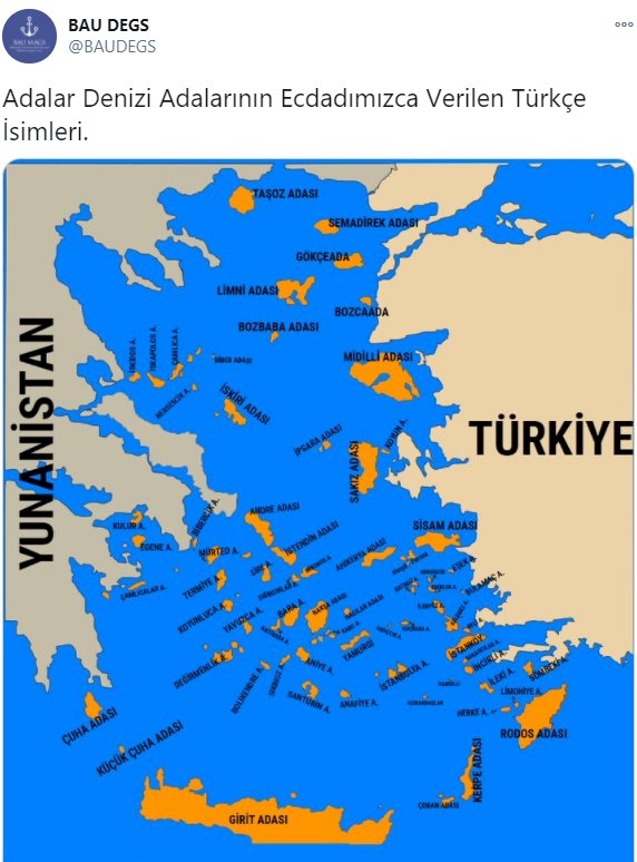 “Adalar Denizi Adalarının Ecdadımızca Verilen Türkçe İsimleri” başlıklı paylaşılan haritaya yorum yapan “inebahtı” isimli hesap şunları yazdı: