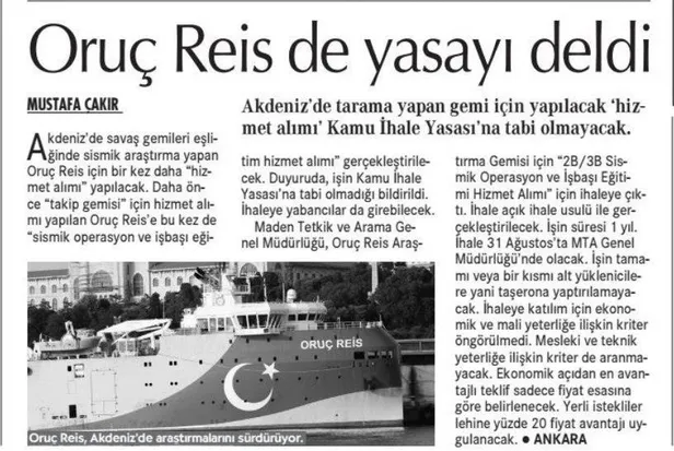 Gazetede yer alan haberde Mustafa Çakır, "Oruç Reis de yasayı deldi" başlıklı bir haberle araştırma gemimizi hedef aldı. Haberde "Akdeniz'de tarama yapan gemi için yapılacak 'hizmet alımı' Kamu İhale Yasası'na tabi olmayacak." iddiasına yer verildi.